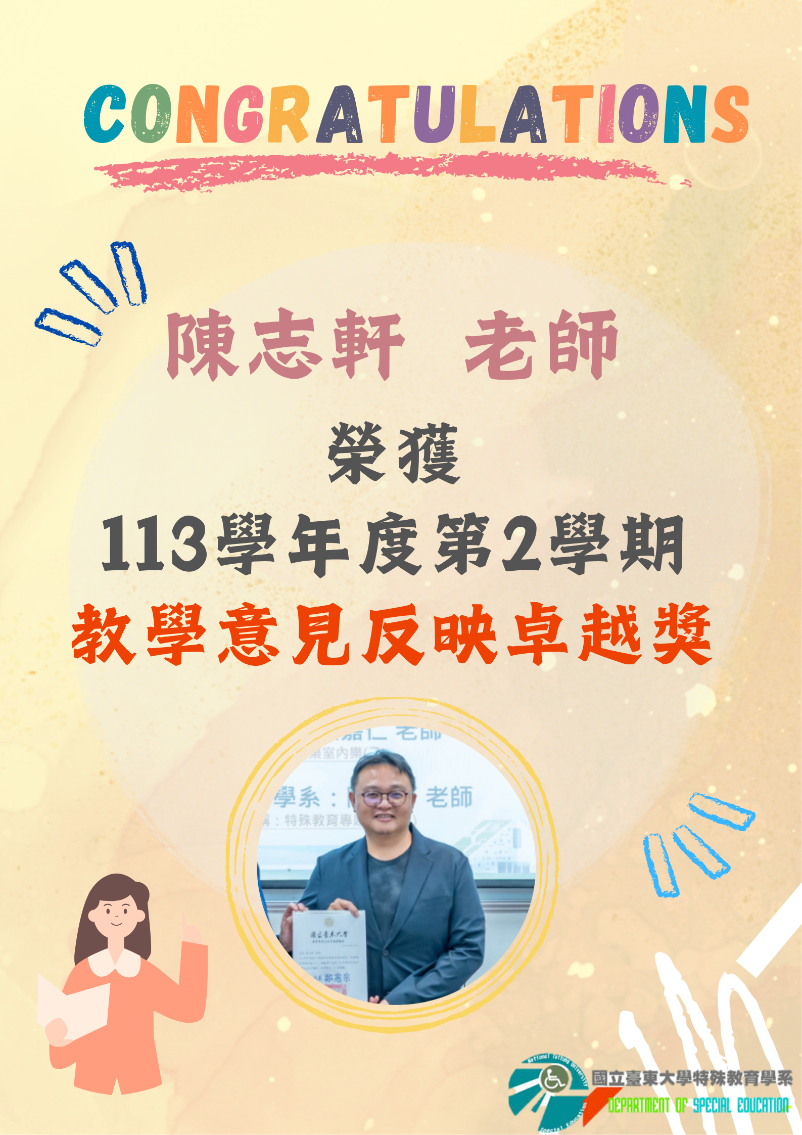 【恭賀】本系 陳志軒老師 榮獲 113學年度第2學期 教學意見反映卓越獎