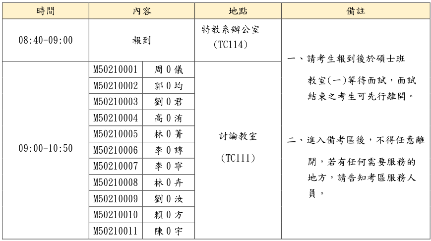 ※面試時程表:(師範學院C棟1樓特殊教育學系)