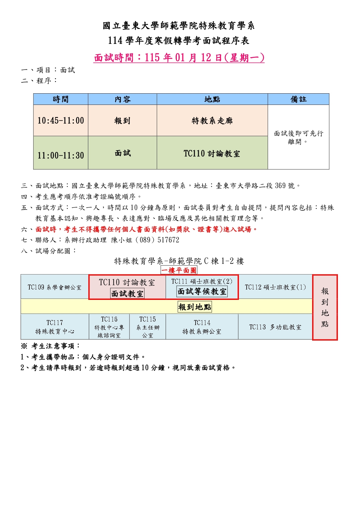 【114學士班寒轉考試】寒假轉學考面試程序表